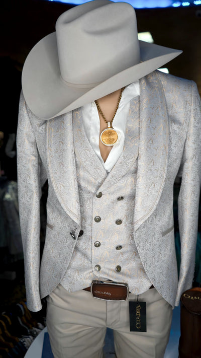 "El Marqués" is a commanding 3-piece luxury suit that radiates prestige and sophistication. The ensemble features a patterned blazer in grey with golden accents, a double-breasted vest that adds a touch of regal refinement, and tailored taupe dress pants for a balanced, elegant contrast. Designed for weddings, galas, and exclusive events, this suit embodies Spanish-inspired grandeur and timeless Western elegance — a true statement of power and style.