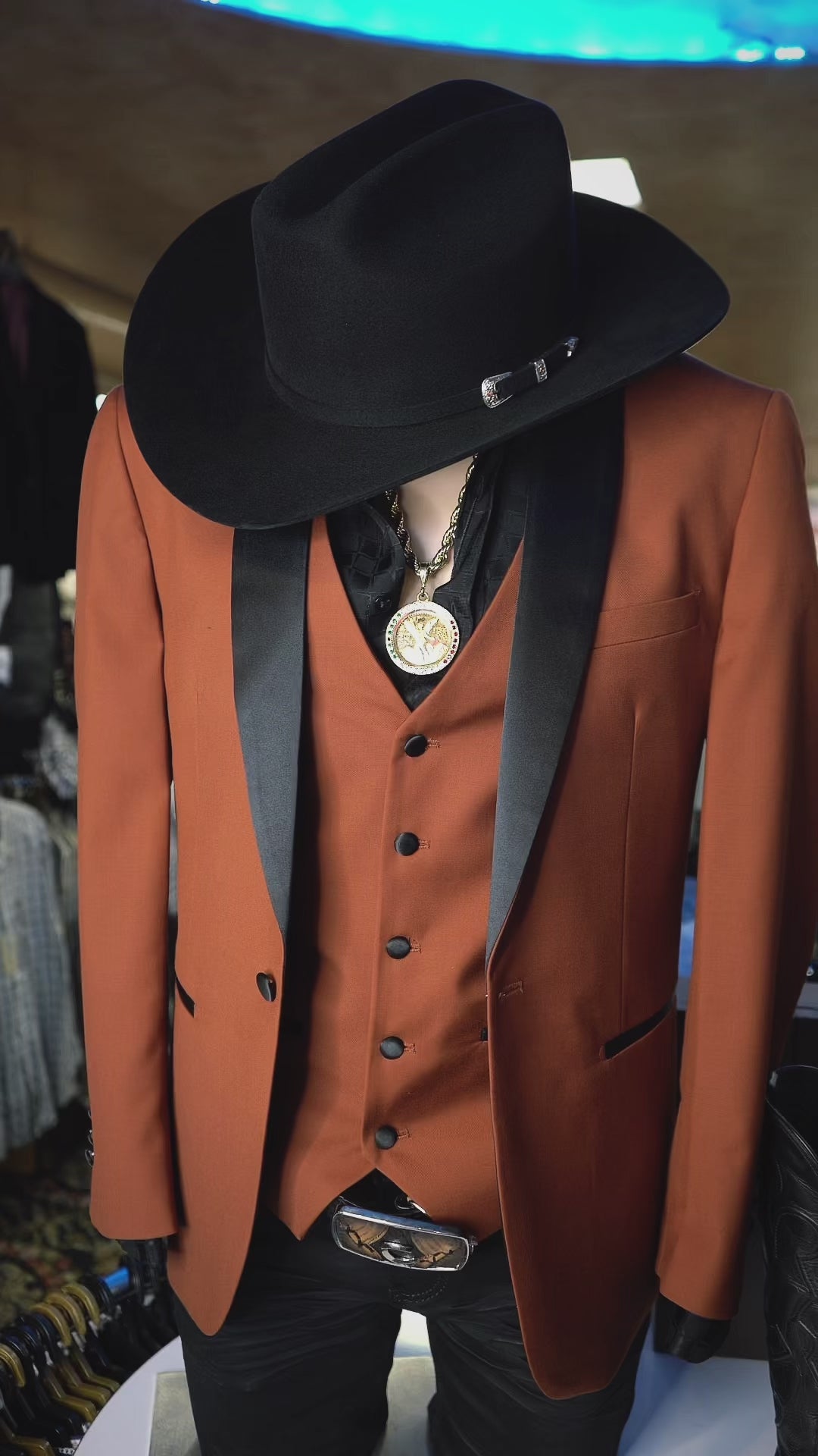 Traje de lujo de tres piezas color cobre óxido de Sanchez Brothers